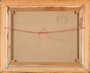 – ponadto na każdej listwie krosna, w połowie jej długości, prostokątna pieczęć składu przyborów malarskich: ISKRA & KARMANSKI | KRAKÓW, poniżej słabo widoczne pieczęci z rozmiarem krosna ...