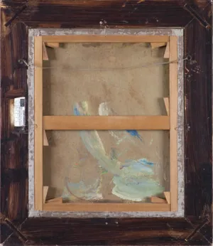 na odwrocie na lewej listwie ramy nalepka paryskiej pracowni ram DELF Cadres d’Art