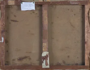 – na płótnie dwukrotnie odbita (l.g. i p.d.) okrągła, nieczytelna pieczęć ponadto na krośnie z lewej strony oznaczenia aukcyjne wykonane białą kredą;