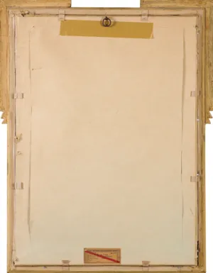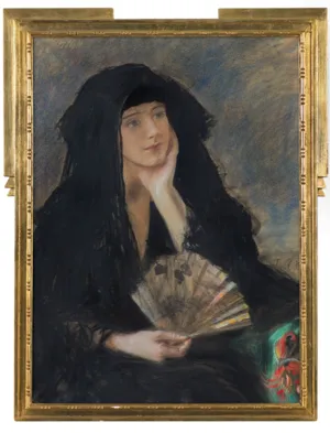 na odwrocie nalepka lwowskiego TPSP (druk, tusz): TOWARZYSTWO PRZYJACIÓŁ SZTUK PIĘKNYCH WE LWOWIE | Nr. ew. 30. Rok 1939. | Autor: Axentowicz Teodor | Tytuł dzieła: „Pani z wachlarzem“ | Rodzaj i technika: pastel | Cena: | Podpis