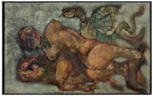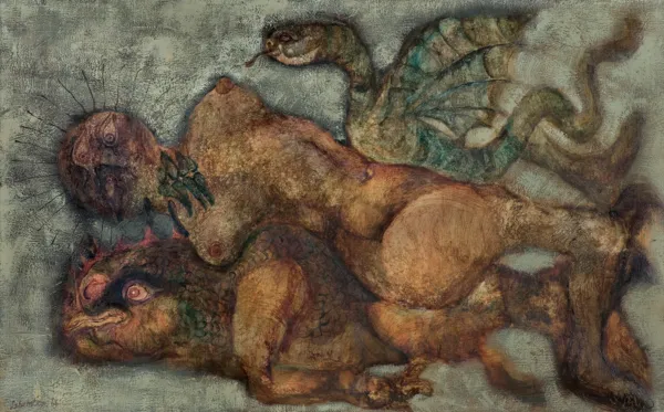 Nie ulega wątpliwości, że malarz trzyma stronę bestii: może pociąga go w niej mieszanina siły i bezbronności, wieczne upokorzenie brutala zwyciężonego przez podstęp, fałszywy triumf niszczącego wszystko potwora. Ale też chodziło mu o ukazanie w gwałtownym rozrachunku zwierzęcości, jaka kryje się pod pozorami wdzięku i kobiecości, i wydaje sie, że nasycił ten swój rozrachunek wspomnieniami własnych bolesnych doświadczeń. Ów taniec na wpół orgiastyczny, na wpół rytualny, w którego wyniku jeden partner pożera drugiego, to widok aż nazbyt zwyczajny w wyniku szalejącej wojny obu płci.