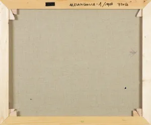 napis na górnej listwie krosna: MELANCHOLIA – 1/1988 73 x 60, na płótnie napis: P OZ 021, przy p. krawędzi pieczątka zezwalająca na wywóz za granicę;