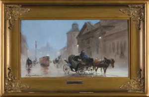 na odwrocie l.g. nalepka ze słabo czytelną pieczęcią urzędową z 1961 roku; ponadto na lewej listwie ramy nalepka The Rowley Gallery w Londynie