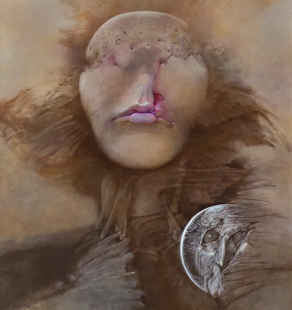 Wizerunek człowieka, a w szczególności ludzkiej głowy, był ważnym wątkiem w twórczości artysty począwszy od okresu abstrakcyjnego. Jak wspomniał w jednym z listów do Piotra Dmochowskiego, twarz stanowiła dlań punkt wyjścia do powstania każdej kompozycji: Aby ruszyć z miejsca zawsze zaczynam od jakiejś twarzy lub od szkicowania twarzy, czasem wychodzi z tego obraz, a czasem już w trakcie szkiców chwytam w żagle coś innego (list z dn. 27 lutego 1985). Traktował ją też jako niewyczerpane pole do improwizacji i poddawał niejednokrotnie daleko idącym przekształceniom, których końcowym efektem były często wyimaginowane antropomorficzne twory. Przykładem bliskiej makabrze wariacji, jest kolejny obraz z kolekcji japońskiej, przedstawiający ujęte en face okaleczone – prawdopodobnie kobiece – oblicze, któremu towarzyszy mniejsze – ujęty w kształt medalionu portret starca.