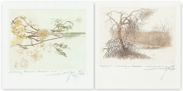 sygn. oł. pod ryc.: Zagajnik z samotnym drzewem – akwaforta | LeszekRózga XII/1984