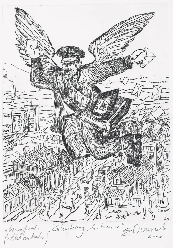 sygn. oł. pod ryc. l: akwaforta | (odbitka autorska), śr.: "Zakochany listonosz", p.: E Dwurnik | 2000