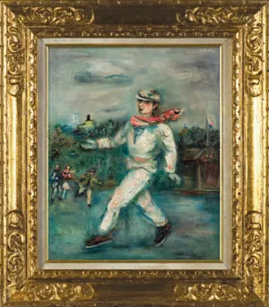 z tyłu, na górnej listwie ramy prostokątna nalepka z opisem obrazu (długopis): “Skating | in Central park“ | 1934 (Oil) | By Jacques Zucker
