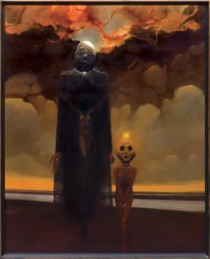 Zdzisław Beksiński stał się znany szerszej publiczności na początku lat 70., kiedy zaczął tworzyć tzw. „pejzaże metaficzyczne“. Pierwsze obrazy tej serii zostały pokazane na słynnej wystawie „Oczekiwanie“ zorganizowanej przez Janusza Boguckiego w warszawskiej Galerii Współczesnej w grudniu 1972. Charakteryzowała je przede wszystkim ściszona, ciemna kolorystyka, występowanie posępnego pejzażu i desygnatów śmierci: trumien, nagrobków, szkieletów, potwornych postaci ze świata apokaliptycznych wizji. Malarska projekcja tych „dreszczowcowych“ treści spotkała się z żywym odzewem w ówczesnej prasie, a nawet na ich kanwie powstał dokument Rozmowa Mistrza ze śmiercią (reż. Franciszek Kuduk, 1973). Kilka kadrów filmu zajmuje „nasz“ obraz – wizerunek nadnaturalnej wielkości zmory prowadzącej na postronku bezbronną, nagą postać. Dzieło nosi wszelkie znamiona stylistyki znanej z „Oczekiwania“. Za ujętą en face, kroczącą wprost na widza parą roztacza się rozległe pustkowie z kłębowiskiem chmur rozstępującym się nad głową kreatury. Zimny blask pada na czarną pelerynę spiętą klamrą w kształcie czaszki, a między rozchylonymi połami materiału majaczy widok ukrzyżowanego, pięknego kobiecego ciała. Połączenie symbolu męczeństwa ze sferą seksualności sięgało jeszcze tworzonych w latach 60. rysunków sadomasochistycznych i przewijało się przez całą twórczość malarza – najbliższym skojarzeniem może być datowana na ten sam rok kompozycja prezentowana na aukcji Agra-Art (13 XII 2020), z niemal bliźniaczą sylwetką rozpiętej na krzyżu kobiety. Częstą obecność wątku erotycznego w scenach przesiąkniętych atmosferą śmierci i przemijania tłumaczył Tadeusz Nyczek: Nieprzypadkowo tak wiele miejsca zajmuje w sztuce Beksińskiego erotyka. Ona właśnie stoi najbliższej źródeł życia i śmierci; w miłości poczyna się nowe istnienie, wreszcie i ona bywa zatratą już bardziej w metaforycznym sensie. (Tadeusz Nyczek, Zdzisław Beksiński albo oswajanie śmierci, „Student“, nr 18 (97), 1973).