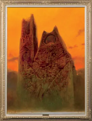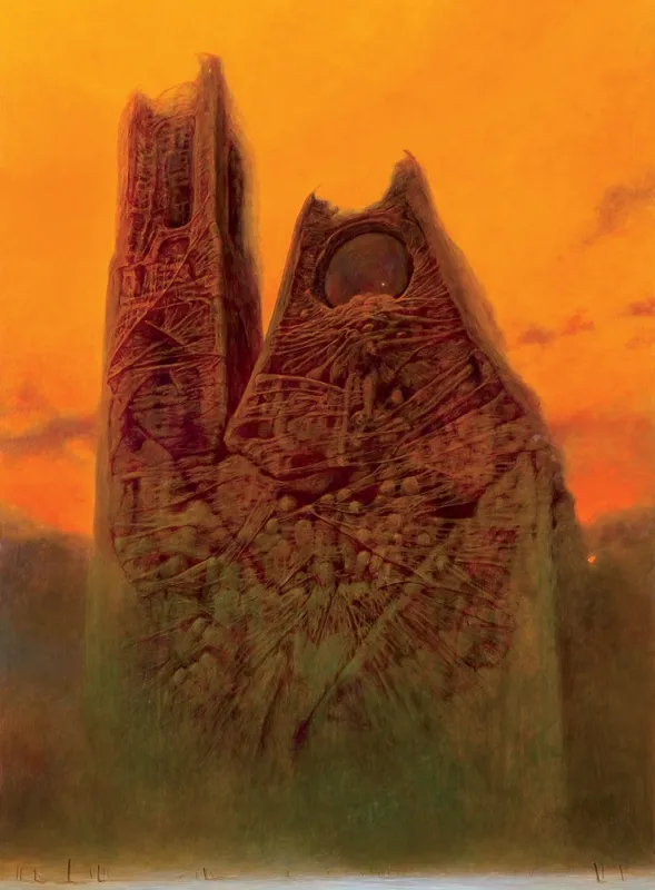 Wydaje się jednak, że do przedstawienia piątej z serii katedry Beksiński subtelnie przemycił znamiona ulubionej stylistyki. Na wstępie uderza w nim intensywność koloru tła, które pulsuje niczym łuna katastrofalnego pożaru. W apokaliptycznym pogorzelisku ostała się jedynie wielka świątynia. Jej budulec to jednak nie kamień czy cegła, ale wielowarstwowa skorupa z grubej, klejącej się pajęczyny, a umieszczona u szczytu, iluzjonistycznie wypukła rozeta bardziej przypomina wielkie oko niż gotyckie okno. Elementy te, podobnie jak celowa asymetria – korpus flankuje tylko jedna wieża – sprawiają wrażenie surrealnej konstrukcji o cechach żywego organizmu, która przyciąga uwagę i niepokoi podobnie jak mroczne obrazy z początku lat. 70.