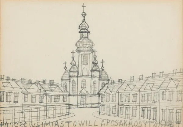 na odwr. szkice (serce, krzyż), notatki (p.d.: Brygida | Bardo [?], l.d.: 1 br. pp-40) i 2 pieczątki zielone: okrągła z półpostacią świętego i napisem w otoku: PAMIĄTKA Z KRYNICY | NIKIFOR MALARZ, niżej prostokątna: NIKIFOR ARTYSTA | KRYNICA – WIEŚ