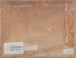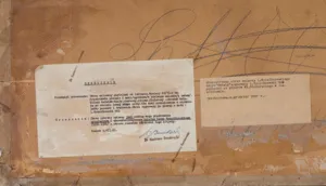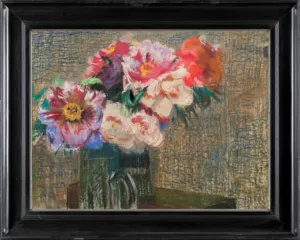 na odwrocie u dołu z lewej orzeczenie dr. Kazimierza Buczkowskiego potwierdzające autorstwo Leona Wyczółkowskiego z 1 lipca 1963 r; obok nalepka zawierająca informacje o pochodzeniu obrazu ze zbiorów Wł. Włodarskigo w Częstochowie z grudnia 1947 roku; ponadto z prawej fragment nalepki (tusz): 1940. | [Leo]n Wyczółkowski | Piwonie […] 19[09]