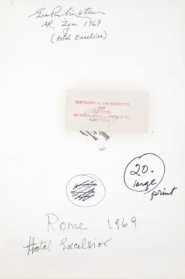 niżej inne napisy ręką autorki oraz 2 pieczątki i częściowo zakrywająca je nalepka: PHOTOGRAPH by EVA RUBINSTEIN | from | LEE GROSS | 366 Madison Avenue New York City | MU. 2-5240
