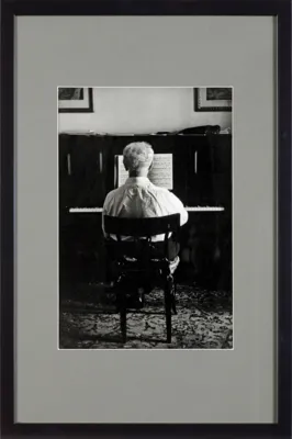 Portret wykonany przez artystkę jakby ukradkiem, zza drzwi, w pokoju apartamentu Hotelu Excelsior, gdzie z matką towarzyszyły pianiście (jej ojcu) w czasie podróży do Rzymu. W apartamencie było pianino do ćwiczeń, Rubinstein był w trakcie przygotowywania dla RCA Italiana Studios nagrania na płytę Sonaty B-dur nr 21 D 960 Franza Schuberta. Artysta uchwycony został po długiej i denerwującej dla niego rozmowie telefonicznej. Był wzburzony, nie mógł się uspokoić, usiadł do pianina i zaczął grać tę sonatę, ćwiczyć dalej. Ewa Rubinstein wspomina, że usłyszała, iż ojciec gra inaczej, ale przepięknie – muzyka Schuberta przejmowała i koiła te złe emocje, uspokoił się. Bardzo ją to wzruszyło, wzięła aparat fotograficzny i zrobiła z pokoju obok zdjęcie. Był to maj 1969 roku, nagrania sonaty dokonano 11 czerwca, płyta (long-play) ukazała się w październiku 1969.