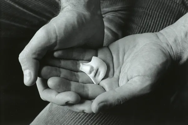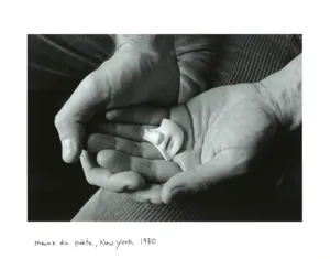 Ręce (dłonie) słynnego amerykańskiego poety Marka Stranda (1934-2014), wykładowcy wielu uniwersytetów, w tym m.in. Princeton, Columbia, University of Chicago, laureata wielu prestiżowych nagród, w tym Pulitzera w dziedzinie poezji, wybranego poetą Stanów Zjednoczonych w 1990 roku. Artystka poznała go, gdy jeszcze był studentem malarstwa w Yale w latach 1957-1958. Ewa Rubinstein mieszkała tam z mężem, pastorem prezbiteriańskim – kapelanem Uniwersytetu Yale. Zdjęcie wykonała w domu poety w Nowym Jorku w 1980 roku. Opowiadał jej, jak bardzo lubił chodzić po plażach i zbierać ciekawe małe rzeczy. Miał półkę z tymi rzeczami, po angielsku to się nazywa beachcomber – osoba szukająca na plaży ciekawych przedmiotów. Potłuczoną twarz lalki też znalazł na plaży. A ponieważ był rozwiedziony, miał jedną córkę, więc taki przedmiot w jego dłoniach zaintrygował artystkę jako temat zdjęcia.
