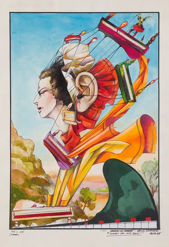 sygn. pod kadrem rysunku l.d.: 175 x 125 | (OBRAZ), p.d.: SZKIC [tytuł przekreślony] !! OTELLO-HORODECKI | "UWAŻAJ JAK MNIE GRASZ !!" 18.06.85