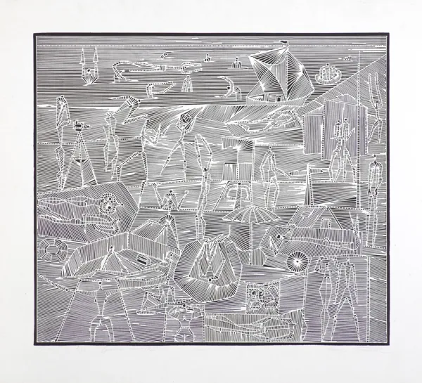 sygn. oł. pod ryc. l.: "Plaża II" 7/50. Epreuve d'artiste, śr.: linoryt 1963 r., p.: Henryk Płóciennik