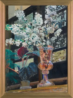 Prezentowany obraz ukazuje, zaszczepioną w Wyczółkowskim przez Feliksa Mangghę Jasieńskiego, fascynację sztuką i kulturą Japonii. Pod wpływem tego znanego krakowskiego kolekcjonera malarz wy posażył swoją pracownię, m.in. w japońską ceramikę, brązy i liczne grafiki. Tłem kompozycji z kwiata mi jest znane z martwych natur (m.in. Białe storczyki i begonia, 1910; Martwa natura, 1905 znajdujących się w zbiorach MNW; patrz poniżej), okno pracowni. Wyklejone przez artystę japońskimi szablonami farbiarskimi wygląda niczym witraż, przez który delikatnie przesącza się światło. Wysoki szklany wazon na dekoracyjnej stopie wypełniają bujnie kwitnące gałęzie wiśni. Kwiaty te uznawane przez Japończy ków za metaforę życia – równie pięknego, ale też delikatnego i krótkotrwałego stały się symbolem wyspiarskiego kraju na antypodach.