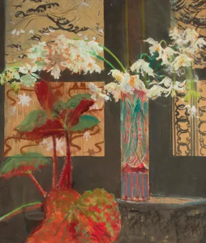 Prezentowany obraz ukazuje, zaszczepioną w Wyczółkowskim przez Feliksa Mangghę Jasieńskiego, fascynację sztuką i kulturą Japonii. Pod wpływem tego znanego krakowskiego kolekcjonera malarz wy posażył swoją pracownię, m.in. w japońską ceramikę, brązy i liczne grafiki. Tłem kompozycji z kwiata mi jest znane z martwych natur (m.in. Białe storczyki i begonia, 1910; Martwa natura, 1905 znajdujących się w zbiorach MNW; patrz poniżej), okno pracowni. Wy...