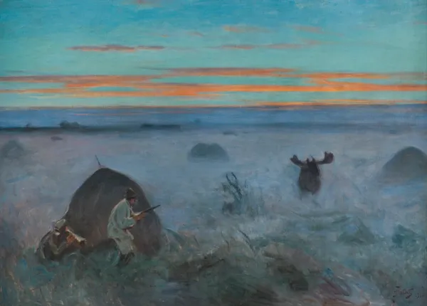 Prezentowany obraz to zapewne wspomnienie nieświeskich polowań, które były niezwykle ważnym w twórczo ści Fałata motywem. Ich poetyckość doskonale opisał w „Sztukach Pięknych“ w 1925 roku Mieczysław Treter: