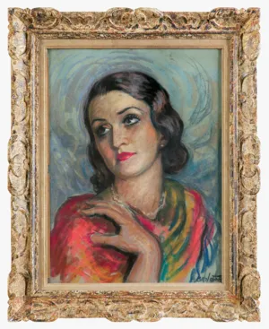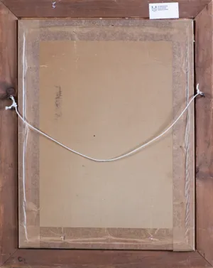 W narożnikach ślady po pinezkach; ponadto l.g. nieczytelna sucha pieczęć wytwórni papieru; na górnej listwie ramy nalepka domu aukcyjnego w Warszawie.