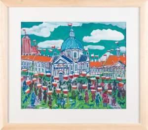 sygn. l.d.: 11 LISTOPADA [w ramce], p.d.: WARSZAWA NOWE MIASTO. E. DWURNIK. 2010, na odwr. sygn. i pieczątki, od g.: „Nowy Rynek“ | [pieczątka z nr wpisanym ręcznie:] NA PAPIERZE | NR 12898, [pieczątka:] AKWARELA | E. DWURNIK [ręcznie:] + tempera | [c.d. ręcznie:] spis NR: 2374 [w ramce] | 8-11.XI.2010 | 46 x 55