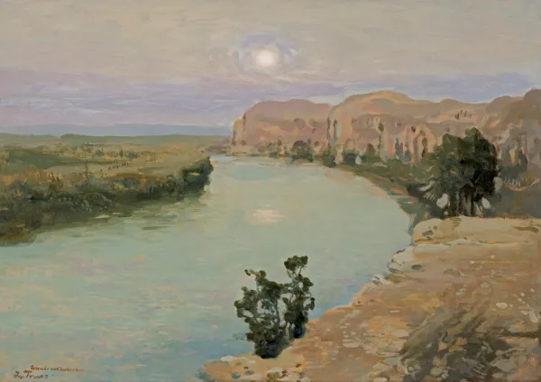 W roku 1912 Iwan Trusz odbył podróż do Egiptu i Palestyny. Owocem tej wyprawy były liczne kompozycje, do których malarz powracał na przestrzeni lat. Od szkiców artysta przechodził do wielkoformatowych pejzaży, takich jak prezentowany Wieczór nad Jordanem. Po roku 1912 i w latach 20. XX w. powstały liczne, autorskie repliki motywów chętnie kupowa...
