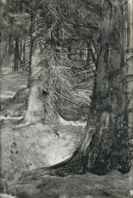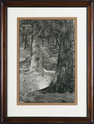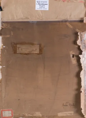 Na odwr. nalepka (druk, maszynopis): Towarzystwo Przyjaciół Sztuk Pięknych w Krakowie | R. 1937 | Nr [pieczęć] 763/7/ | Autor Leon Wyczółkowski | Własność xx p. Bartke | Adres | Dzieło Stary świerk | Wykonanie tusz; na nalepce pieczęć: WYSTAWA POŚMIERTNA | L. WYCZÓŁKOWSKIEGO;