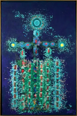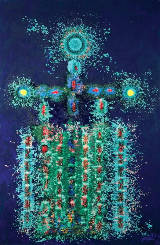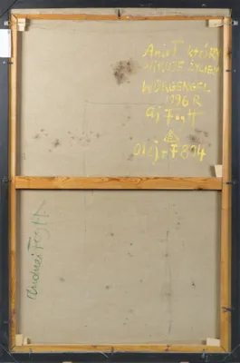 sygn. na odwr. żółtą farbą p.g.: Anioł który | WIRUJE ŻYCIEM | WÜRGENGEL | 1996 R | Aj Fogtt | [znak trójkąta z wpisaną literą] E | Olej + F804, l.d. wzdłuż krawędzi: Andrzej Fogtt