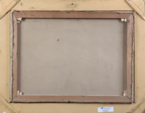 Na odwrocie na górnej listwie krosna (niebieską kredką): 3857 [...] / 330; na lewej i prawej listwie krosna numer (ołówkiem): 74; ponadto na dolnej listwie ramy nalepka zakładu ramiarskiego w Ożarowie Mazowieckim.