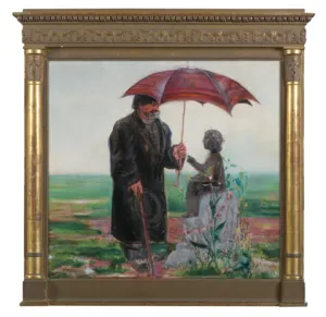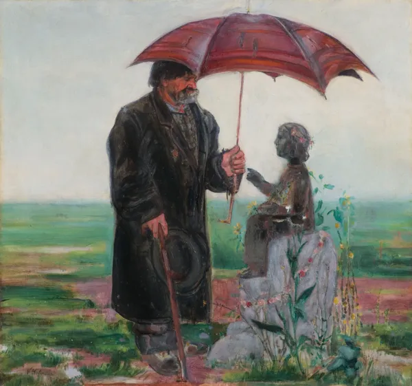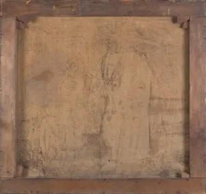 Na odwrocie nalepka z wystawy lwowskiego TPSP w 1908 roku (druk, tusz): Towarzystwo Przyjaciół Sztuk Pięknych we Lwowie | Nr 2397 | Nazwisko Hoffman Wlastimil | Adres | Tytuł Boże słowo | Rodzaj ol [...]eon; ponadto nr: 2397 powtórzony na lewej listwie krosna.