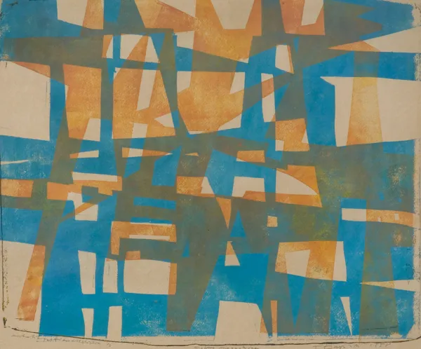 sygn. oł. pod ryc. l.: autolitografia kolorowa 1/3, śr.: Formy niespokojne, p.: T. Łapiński 1958