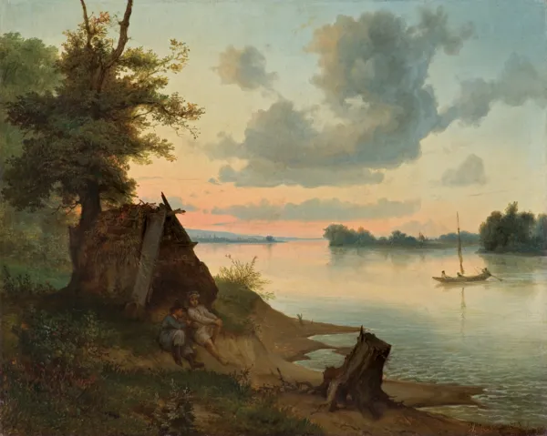 Według spisu prac zamieszczonego w notatniku Gersona w roku 1853 artysta namalował obraz zatytułowany Widok znad brzegu pod Drohiczynem o zachodzie słońca. Jest to jedyny wzmiankowany pejzaż datowany na ten rok, jednak znajdujący się na odwrocie obrazu, umieszczony na płótnie dublażowym, napis wskazuje na brzegi Wisły. Za widokiem Wisły może świadczyć również fakt, że artysta w 1853 roku udał się Wisłą w dół rzeki, wędrując po Mazowszu i Kujawach.