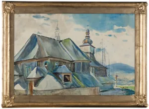 Osobnym tematem akwarel są wiejskie drewniane kościółki w Osieku (1906 i 1915), Łodygowicach (1918) czy Mikuszowicach (1911 i 1913), w których refleksy słoneczne, cienie drzew wykonywane rozwodnionymi akwarelami tworzą niespokojną, migotliwą kompozycję wzajemnie przenikających się i zlewających się przypadkowych plam.
