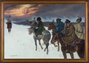 Z roku 1913 pochodzi jeden z najsławniejszych i bardziej popularnych obrazów [pierwszy z serii] Jerzego Kossaka: Widzenie Napoleona w odwrocie spod Moskwy, z głową Sfinksa na tle chmur, przypominającego egipskie zwycięstwo „boga wojny“, który teraz ze sztabem i na tle niekończącej się colonne mourante swych wojsk ciągnie na zachód wśród zamieci, złamany zimą i mrozem. (...) ...
