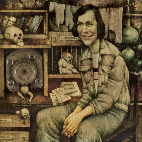 Ryszard Marek Groński (1939-2018) – pisarz, poeta, publicysta, twórca tekstów piosenek i opowiadań dla dzieci – był znaczącą postacią polskiej sceny kabaretowej oraz autorem opracowań na temat jej historii. Współpracował z wieloma czasopismami, m.in. satyrycznymi „Szpilkami“. W latach 70. na ich łamach swoje prześmiewcze rysunki zamieszczał – zacieśniający wówczas związki z estradowym środowiskiem – Jerzy Duda Gracz. Znajomość malarza z takimi artystami jak Kazimierz Grześkowiak, Jonasz Kofta, Wojciech Młynarski oraz „tytułowy“ Ryszard Marek Groński – owocowała wykonywaniem licznych portretów. W prezentowanym przedstawieniu malarz skupił się nie tylko na oddaniu cech fizjonomicznych satyryka, ale także na atrybutach profesji. Ujęty w swobodnej pozie, uśmiechnięty młody mężczyzna siedzi we wnętrzu przypominającym rzemieślniczy warsztat. Techniczny charakter pomieszczenia podkreśla wtłoczony w obręb kompozycji zębaty mechanizm. Ta wyjątkowa, na poły symboliczna sceneria sprawia, że tytułowy poeta jawi się jako trafnie oceniający rzeczywistość fachowiec, którego narzędziem pracy – czasami bezlitosnym i kąśliwym – jest pióro.