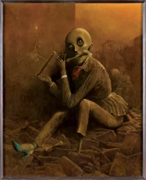 Jedną z owych słynnych, makabrycznych wizji był oferowany w niniejszym katalogu obraz, który – niczym projekcja koszmarnego snu – prezentuje osobliwą wersję końca świata. W bliskim grotesce przedstawieniu bezwłosa kobieca postać siedzi na gruzach zrujnowanego miasta i obgryza kości. Jest wychudzona, przerażona i kaleka. Z drastycznym wizerunkiem silnie kontrastuje elegancki strój portretowanej: żakiet z fantazyjną falbaną, czerwona apaszka, śnieżnobiała koszula i zielone czółenko na wysokim obcasie. Dopełnienie kompozycji szeregiem innych, drugoplanowych rekwizytów – m.in. miniaturowym krzyżem i lśniącymi, szklanymi paciorkami – zaskakuje i skłania do snucia interpretacji. Nieodzowne przy takim ładunku treści mnożenie znaczeń odbywało się wbrew autorowi, który podkreślał w wywiadach: Nigdy nie zadaję sobie pytania „co to znaczy“ ani w odniesieniu do moich obrazów, ani do cudzych. Znaczenie jest dla mnie całkowicie bez znaczenia. Jest tyle warte, ile smak czekolady w opisie literackim (Znaczenie jest dla mnie bez znaczenia, rozm. przep. Z. Taranienko, „Sztuka“, 1979, nr 4, s. 34). Dla większości współczesnych pejzaże wywoływały jednak na tyle proste skojarzenia, że artystę okrzyknięto wkrótce piewcą „totalnego strupieszenia świata“. Mimo zarzutu epatowania horrorem, na zakup obrazów z grupy „Oczekiwania“ zdecydowało się wielu zwiedzających, a cała wystawa została uznana za przełomową w dorobku malarza. Wrażenia po niej spisał w swoim dzienniku: malować muszę teraz jak wściekły, bo na lipiec, a może nawet i na czerwiec, muszę mieć obrazy na wystawę z Urbanowiczem i Wańkiem, więc jeśli wszystko kupiono (hi,hi), to nie mam co wystawiać, jestem goły! (M. Grzebałkowska, Beksińscy. Portret podwójny, Kraków 2016, s. 156).