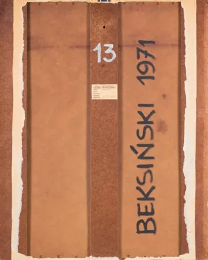 sygn. na odwr. na płycie po prawej: BEKSIŃSKI 1971, na pionowej listwie numer 13, poniżej nalepka Galerii Współczesnej w Warszawie z datą wystawy 7 XII 72 - 7 I 73.