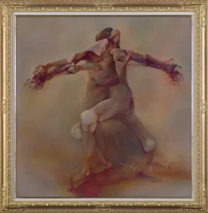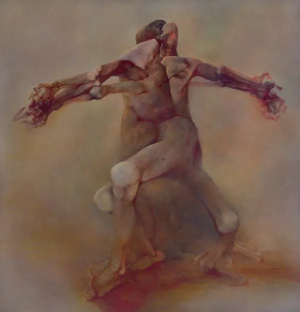 Prezentowana w niniejszym katalogu, zawieszona w nieokreślonej przestrzeni humanoidalna figura jest popisem malarskich umiejętności artysty. Tworzące ją dwa scalone ciała o symetrycznie rozpostartych ramionach ujmują rzeźbiarskim modelunkiem i dynamicznym ujęciem. Monochromatyczną gamę barwną przełamują krwistoczerwone akcenty: strużki przebiegające przez zdeformowaną sylwetkę postaci i kałuża rozlewająca się u jej stóp. Trudno jednak dopatrywać się tutaj reminiscencji estetyki gore właściwej drastycznym przedstawieniom z wcześniejszych lat. Subtelne przejścia tonalne pomagają osiągnąć odpowiednią architektonikę obrazu i wydobyć jego trójwymiarowość. Artysta tak objaśniał swą twórczą ewolucję: Idę w kierunku większego uproszczenia tła, a równocześnie znacznej deformacji postaci, które są namalowane bez tzw. światłocienia naturalistycznego. Właściwie chodzi mi o stworzenie jakiejś własnej formy. Chodzi o to, żeby na pierwszy rzut oka było widoczne, że jest to obraz zrobiony przeze mnie (Liczba jego 66, Beksiński w rozmowie z C.A. Skrobałą, „Dziennik Polski“ nr 298-1, 28 XII 1995).