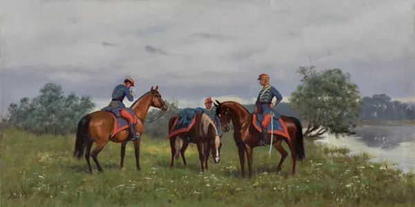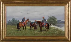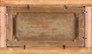 Na odwrocie płótna zatarty owalny stempel wytwórni materiałów malarskich.