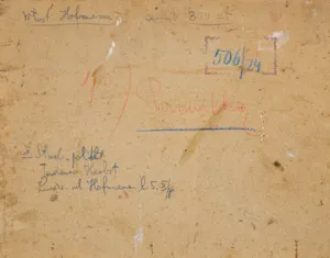 Na odwrocie l.g. (niebieską kredką): Wlast. Hofmann cena 850 zł; poniżej numer w prostokątnej pieczęci: 506/24; centralnie (czerwoną kredką): 43) Pamiątka; l.d. (niebieską kredką): wł. Stach. poli[...] | Tadeusz Herbst | Lwów. ul. Hofmana. l.5. II | p