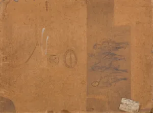 Na odwrocie szkic koni i woźnicy; ponadto dwie owalne pieczęci magazynu przyborów malarskich Róży Aleksandrowicz w Krakowie; centralnie umieszczona pieczęć składu przyborów malarskich – firmy „Lefranc et Cie“: kotwica skrzyżowana z kaduceuszem pomiędzy literami L F (znak firmy Lefranc); p.d. nalepka (druk, tusz): ZWIĄZEK POWSZ. ARTYSTÓW POLSKICH | W KRAKOWIE. | Data przyjęcia 7/12 19[20] | [A]utor Geppert Eugeniusz | Tytuł Drynda...