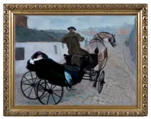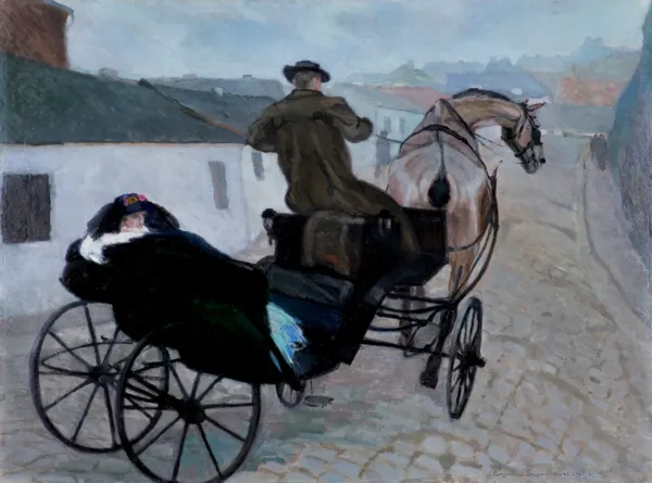 Na odwrocie szkic koni i woźnicy; ponadto dwie owalne pieczęci magazynu przyborów malarskich Róży Aleksandrowicz w Krakowie; centralnie umieszczona pieczęć składu przyborów malarskich – firmy „Lefranc et Cie“: kotwica skrzyżowana z kaduceuszem pomiędzy literami L F (znak firmy Lefranc); p.d. nalepka (druk, tusz): ZWIĄZEK POWSZ. ARTYSTÓW POLSKICH | W KRAKOWIE. | Data przyjęcia 7/12 19[20] | [A]utor Geppert Eugeniusz | Tytuł Drynda | Rodzaj olej. Rozmiar | Cena Nr. 2/[...]