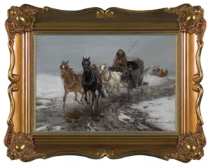 Na odwr. dwukrotnie owalna pieczęć: PAŁAC SZTUKI | Sp. z o.o. | Warszawa Trębacka 2, [...] 37 -87. | Antykwarnia | Sala Licytacyjna | Obrazy Meble Dywany; ponadto pomiędzy powyższymi pieczęciami stempel: PAŁAC SZTUKI | (PA[...]ART) | Warszawa [...].