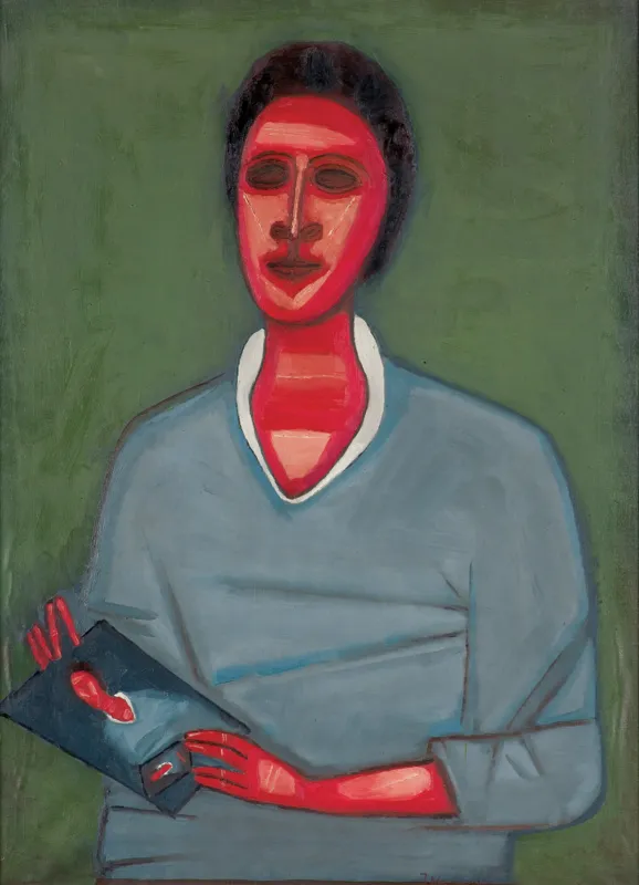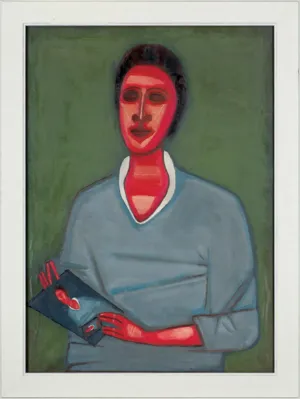 Przedstawienie kobiety, a szczególnie jej ciała, zajmuje wyjątkowe miejsce w sztuce Jerzego Nowosielskiego. Artysta, chcąc „przywrócić cielesności duchowe znaczenie“ wypracował własny kanon aktu, który stał się elementarnym motywem jego malarstwa. Obok nagich, niekiedy kontrowersyjnych „panien nowosielskich“, twórca „świeckich ikon“ rozwijał także – chociaż nie tak intensywnie – bardziej oficjalny nurt malarstwa portretowego, pozbawiony odniesień do erotyzmu. Pierwsze wizerunki kobiet do niego należące, wykonane techniką akwarelową i olejną pojawiały się w latach 40. Były to z reguły popiersiowe ujęcia o zindywidualizowanych cechach, często za pomocą sugestywnego, pojedynczego gestu czy spojrzenia oddające charakter bohaterki. Z czasem rysy twarzy uległy hieratycznej typizacji czerpiącej wzorce z malarstwa ikonowego. Tak opisywała je Bożena Kowalska: Postaci z obrazów Nowosielskiego nie posiadają nic z jednostkowego życia. Cechuje je wyniosła godność, nietykalne dostojeństwo oraz majestat mistycznego trwania. Ich poza i ponadczasowość, metafizyczny dystans spokrewniają je z postaciami ikony. Przytoczona charakterystyka koresponduje także z prezentowanym w katalogu Portretem pani w niebieskiej sukni. Jej sylwetka ukazana na jednolitym, abstrakcyjnym tle, odwołuje się do znanych z ikon schematów kompozycyjnych. Nieme oblicze, ostro rzeźbione umownym światłocieniem, jest pozbawione oczu – zamiast nich ukazują się dwa otwory o migdałowatym kształcie. Tego typu zabieg, pojawiający się w wielu innych portretach Nowosielskiego, czasami przyjmował też formę ściśle przylegających do twarzy, czarnych okularów. Rzadkością były natomiast atrybuty towarzyszące portretowanej osobie. Tytułowa „pani“ pokazuje fotografię lub obraz przedstawiający ją samą trzymającą w rękach swój portret. Podobną koncepcję „obrazu w obrazie“ artysta zastosował w dziele W pracowni z 1957 roku, gdzie ubrana w czerwony płaszcz kobieta, przegląda się – niczym w lustrze – w płótnie stojącym na sztaludze. Kilkukrotne powtórzenie wizerunku skromnej i anonimowej, „pełnej bizantyńskiej powagi“ kobiety, nadaje – temu na pierwszy rzut oka surowemu i ceremonialnemu przedstawieniu – niezwykłej aury poetyki i tajemniczości.