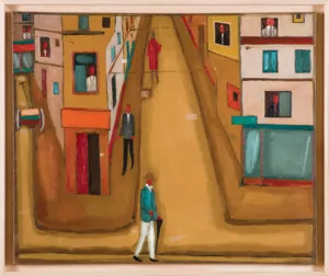 Pejzaże Nowosielskiego nie są jednak wiernym odwzorowaniem miast. Nowosielski nadaje im cechy metafizyczne. Wypracowuje własny, charakterystyczny sposób kształtowania przestrzeni. Decydująca jest – jak pisze Krystyna Czerni – kompozycja obrazu, organizacja płaszczyzny według sieci archetypicznych form: trójkątów, trapezów, kwadratów. Jakby cała rzeczywistość: ta ziemska i niebiańska, realna i wyobrażona – miała jeden, wewnętrzny szkielet; wspólną porządkującą konstrukcję. W pejzażach Nowosielski lubi ujęcia z góry, widziane z lotu ptaka (czy okiem Boga?): strome, wyludnione ulice, miejskie osiedla przecięte szynami tramwajów, niekończące się pierzeje kamienic – naznaczone rytmem tajemniczych błękitnych okien, uchylonych drzwi [...]. cyt. za Krystyna Czerni, Jerzy Nowosielski, w: Wielcy Malarze. Ich życie, inspiracje i dzieło, Nr 105, s. 14