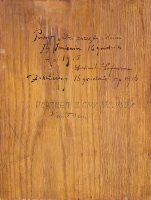 Na odwrocie napis autorski czarnym olejem: Portret Adzi poczęty w dniu | Jej imienin 16 grudnia | r.p. 1915 | Wlastimil Hofmann | Dokończony 16 grudnia r.p. 1916; poniżej napis: PORTRET ŻONY ARTYSTY | 41 cm x 31 cm