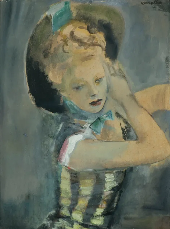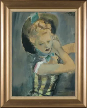 Na odwrocie l.g. prostokątna nalepka z czerwoną ramką (marker, cienkopis): 221 | GOUACHE PORTRAIT | BY | RAYMOND KANELBA; ponadto p.d. ośmioboczna nalepka z powtórzonym nr. (czerwonym flamastrem): 221; ponadto na dolnej listwie ramy nalepka aukcyjna.