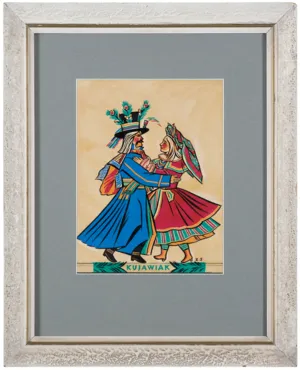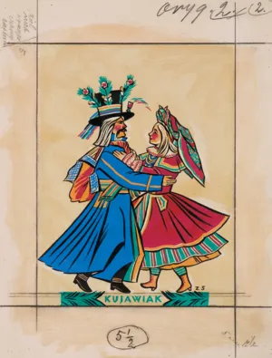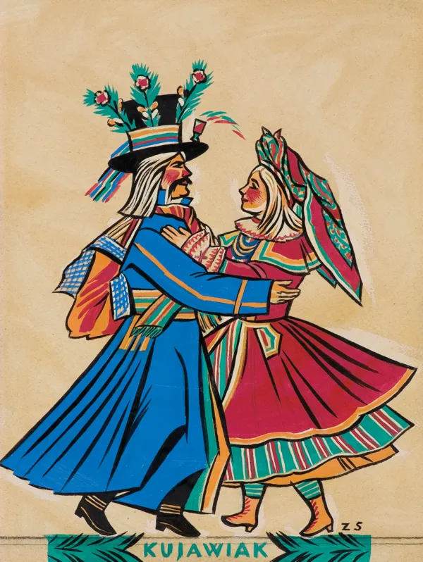 Cykl „Tańce polskie“ Zofia Stryjeńska opracowała i wydała po raz pierwszy w 1929 roku w Drukarni Narodowej w Krakowie. Teka zawierała 11 plansz wykonanych w technice rotograwiury. W 1954 roku wydawnictwo „Tańce polskie“ według rysunków Zofii Stryjeńskiej ukazało się ponownie – tym razem tłoczone przez T. Wallicha w Paryżu. Teka zawierała 5 plansz w technice metalorytu. Przedstawienia poszczególnych tańców w tym wydawnictwie oparte są w ogólnych zarysach na kompozycjach z 1929 roku, lecz odbiegają od nich zarówno w szczegółach rysunku, jak w kolorystyce. Stąd wniosek, że były to projekty opracowane przez artystkę na nowo. Detale i kolorystyka oferowanej pracy są identyczne z planszą pt. Kujawiak z wydawnictwa z 1954 roku, reprodukowaną w katalogu-monografii artystki.
