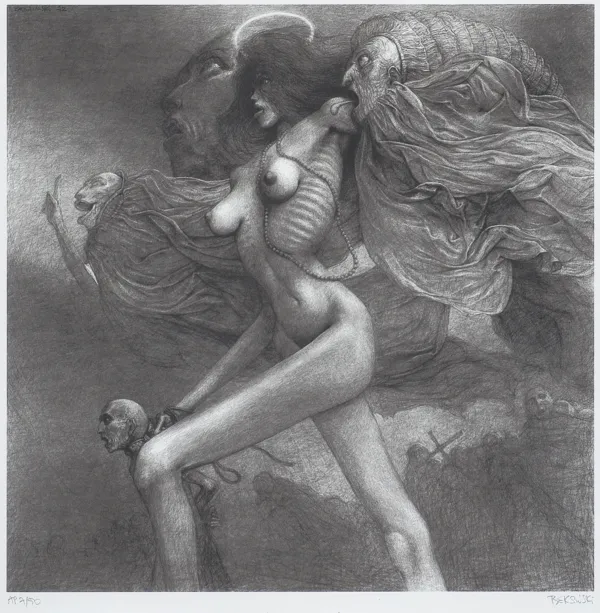 Autoryzowana graficzna replika rysunku czarną kredką, oryg. wymiary: 62 x 62 cm, reprodukowanego w albumie: Beksiński. Photographies, dessins, sculptures, peintures, [oprac. i red.] Anna i Piotr Dmochowski, API [AP International, Ltd.], wyd. I [Paris] 1988/89, wyd. II popr. [Paris] 1991, s. 150, kat. 187