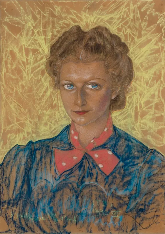 Portret pani Alizy należy do typu B i w pełni realizuje powyższe założenia. Modelka przedstawiona jest realistycznie, z umiejętnym wydobyciem jej klasycznej urody, co możemy łatwo zauważyć, porównując jej portret z fotografią. Artysta powiększył jej błękitne oczy, pokreślił kształt i nieznacznie zmniejszył czerwone usta, powtórzył cieniutkie łuki brwi, wygładził cerę, lekko skorygował owal twarzy oraz nieznacznie wydłużył szyję. Precyzyjnie odtworzył zgodną z ówczesną modą fryzurę ze starannie zakręconych i upiętych na głowie loków. Dzięki tym zabiegom kobieta z pewnością zyskała na urodzie, nie zaburzyło to jednak wierności portretu. Zarysowane żółtymi kreskami tło nie zakłóca całości, za to ładnie kontrastuje z granatową bluzką modelki przewiązaną pod szyją koralową wstążką w białe groszki.